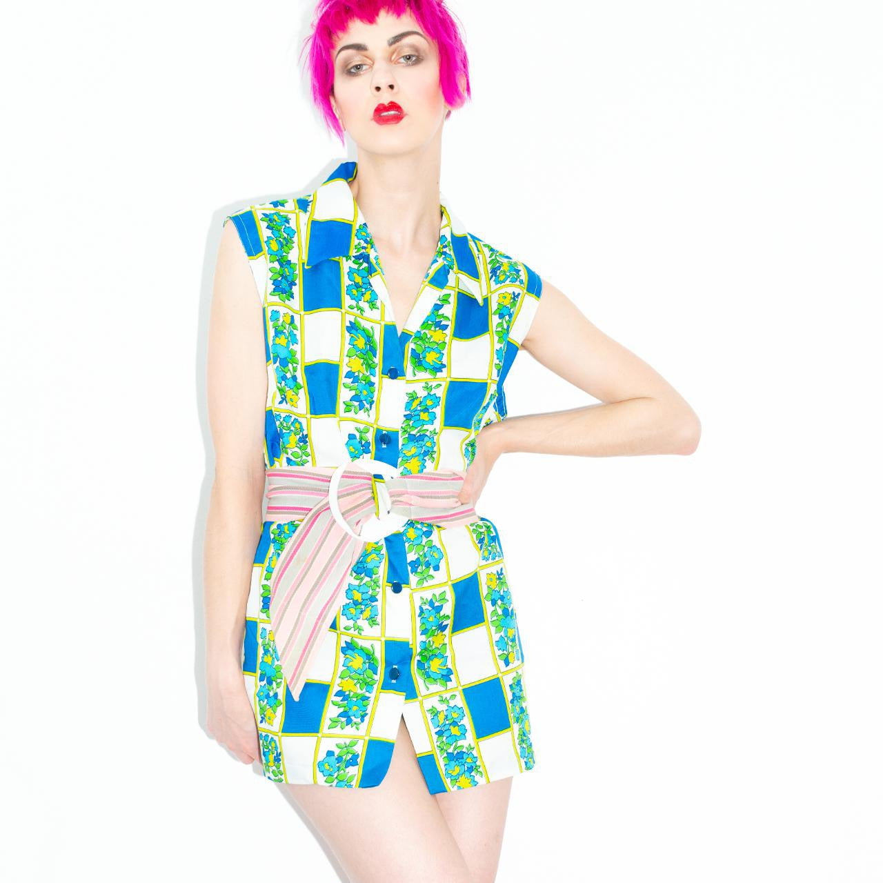 Bright blue, green, yellow, and white grid/flower pattern on this sleeveless button-up collar blouse with serious tropical vibes.