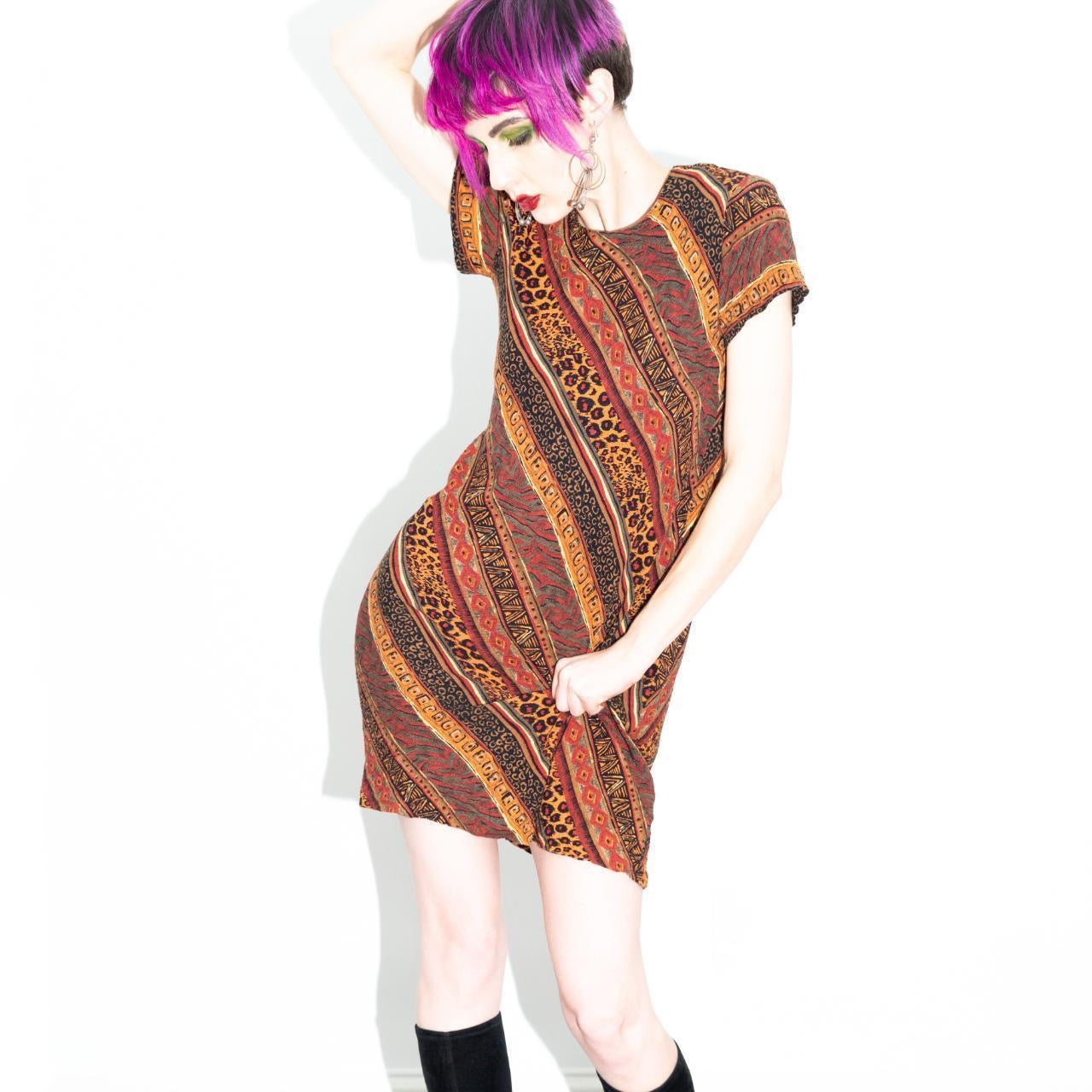 Sick vintage 90s multi animal print stripes dress with small shoulder pads. Ultra comfy and flattering cut. Zebras, cheetahs, and leopards- oh my