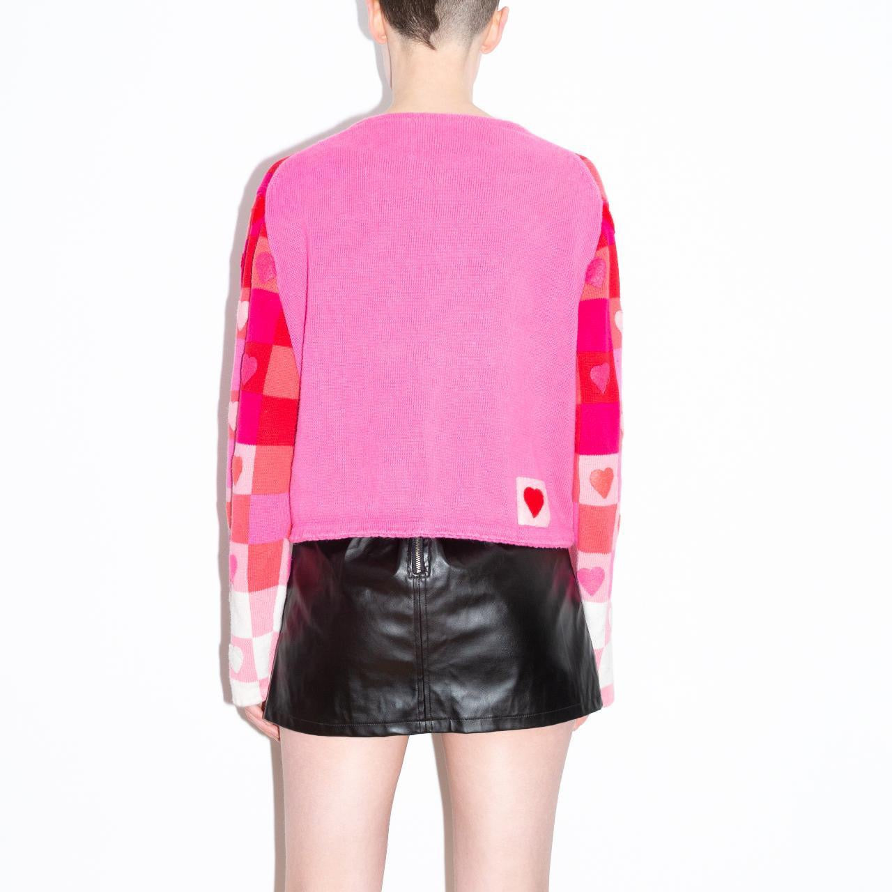 Red to hot pink to baby pink to white ombré effect patchwork grid knit sweater with felt contrasting hearts. Button down cardigan style with shiny red heart button closure, Barbie pink back half, and little felt square with red heart on back right. Nice weight and soft. Super rare and unique heart print piece.
