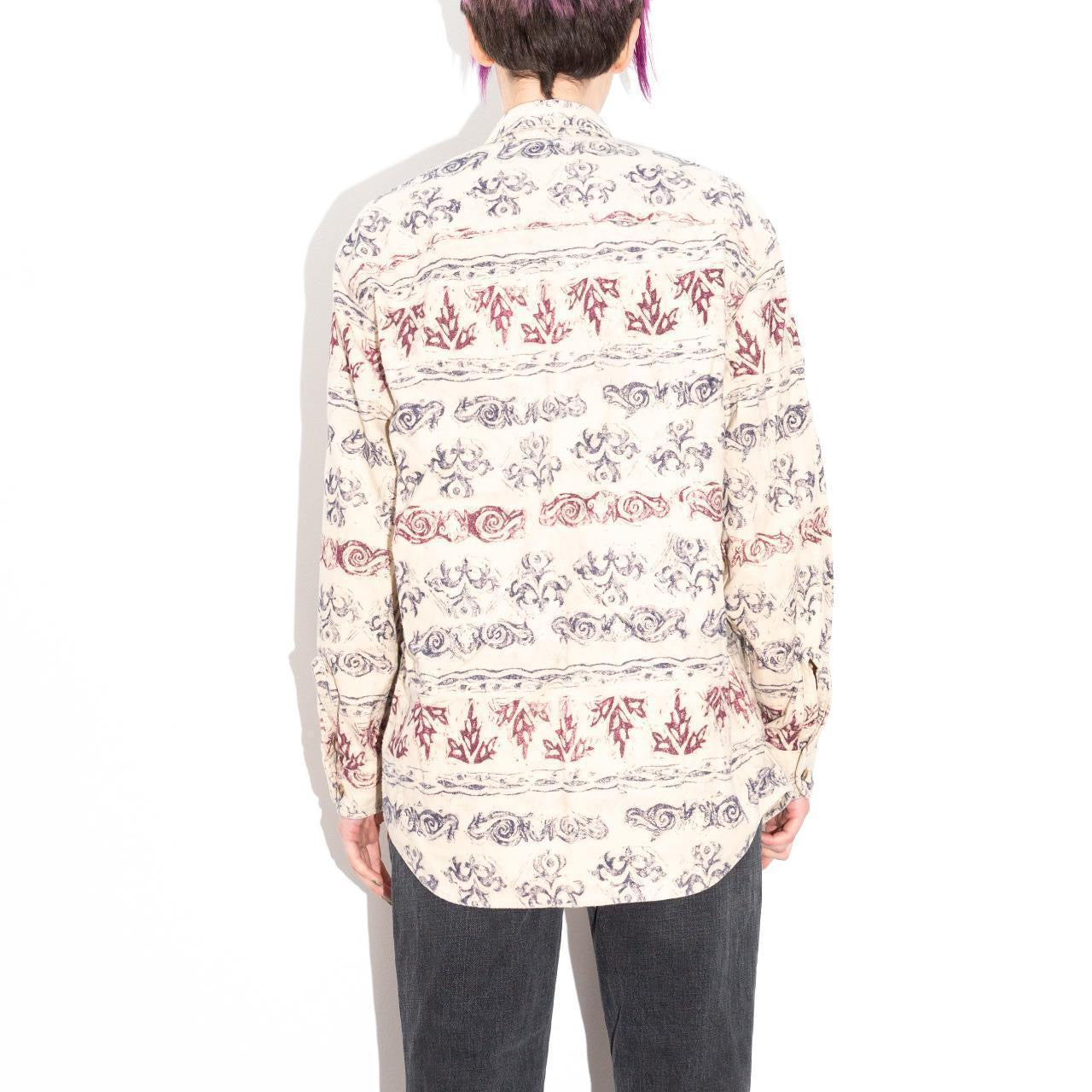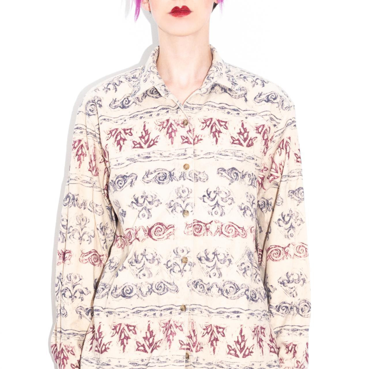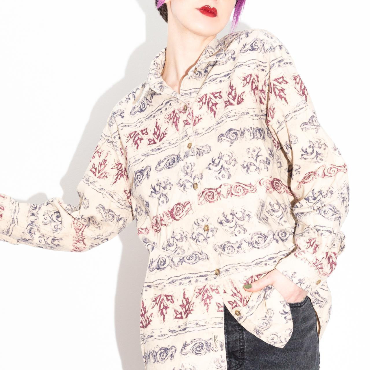 Oat-colored flannel button-down vintage shirt by Woolrich (labeled women's but is genderless and fits as such). Interesting gray and burgundy red abstract print in stripes